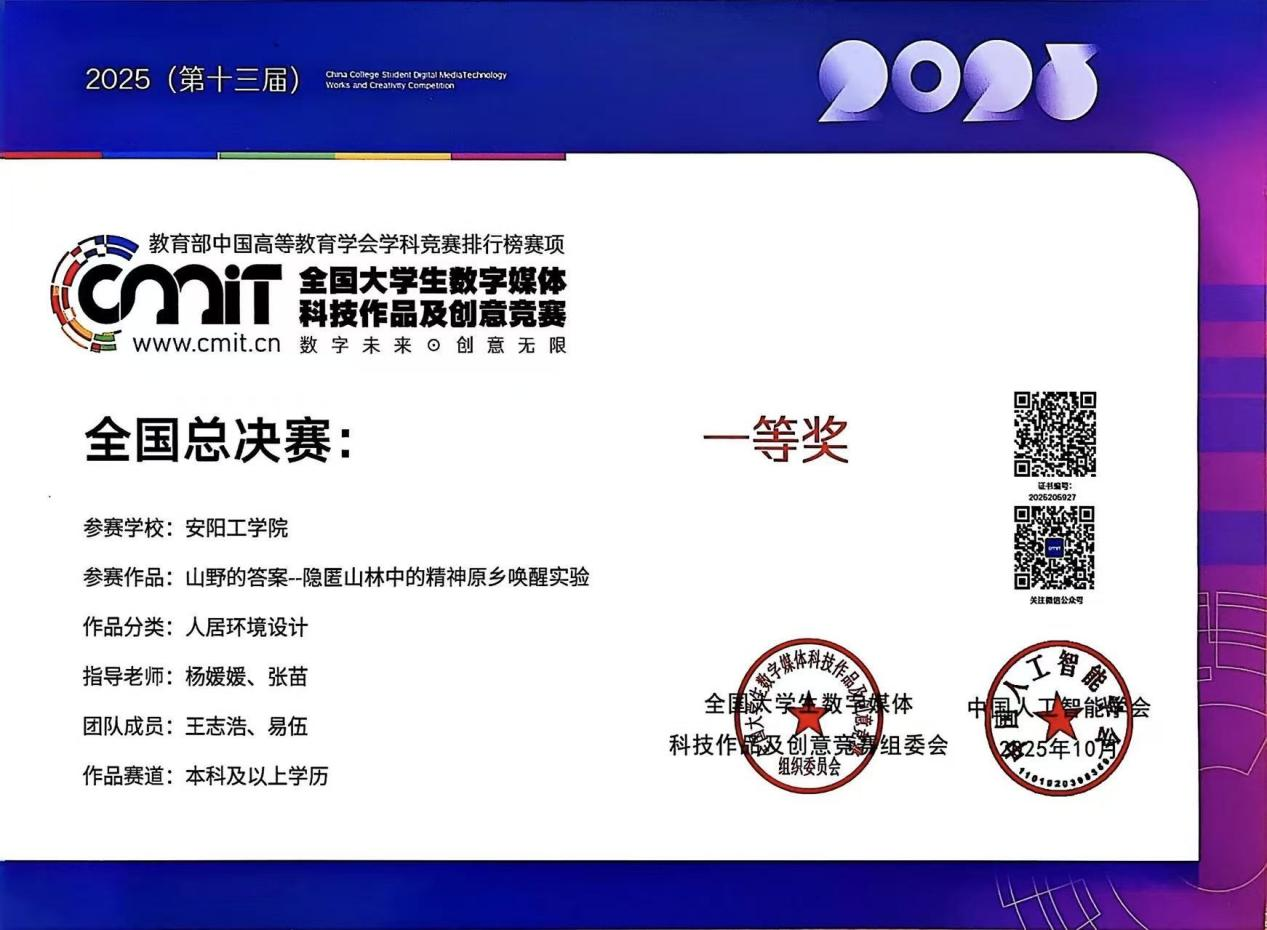 王志浩、易伍作品《山野的答案--隐匿山林中的精神原乡唤醒实验》荣获人居环境设计类全国一等奖杜思妍雷钊作品《巷弄新生:从旧时光中长出新力量》荣获人居环境设计类全国等奖王志浩作品《湖山凝境--基于湖山共生的生态型文化博物馆》荣获人居环境设计类全国等奖。本届大赛由中国人工智能学会、全国老员工数字媒体科技作品及创意竞赛组委会主办,哈尔滨工业大学承办,共有1187所高校的50余万名员工参与,征集作品总数超过17万件。
