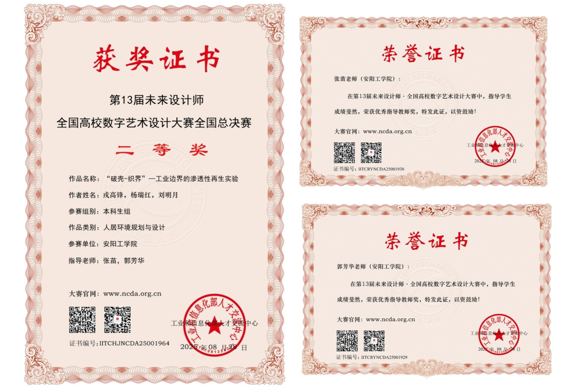 在2025第13届未来设计师·全国高校数字艺术设计大赛(NCDA)竞赛中,公司师生荣获人居环境规划与设计类全国总决赛二等奖一项、河南赛区奖项六项;张苗、郭芳华、于盼盼、杨媛媛、王昭娜、刘赚六位教师荣获“优秀指导教师”奖。